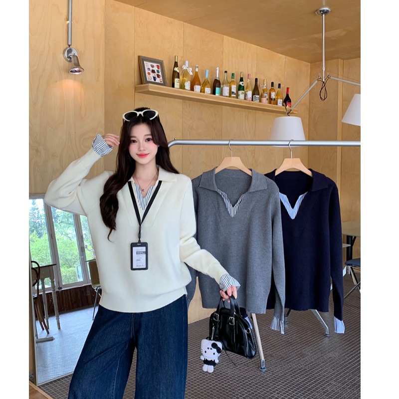小吉家大码女装秋装新款条纹拼接软糯针织毛衣miu系宽松百搭上衣