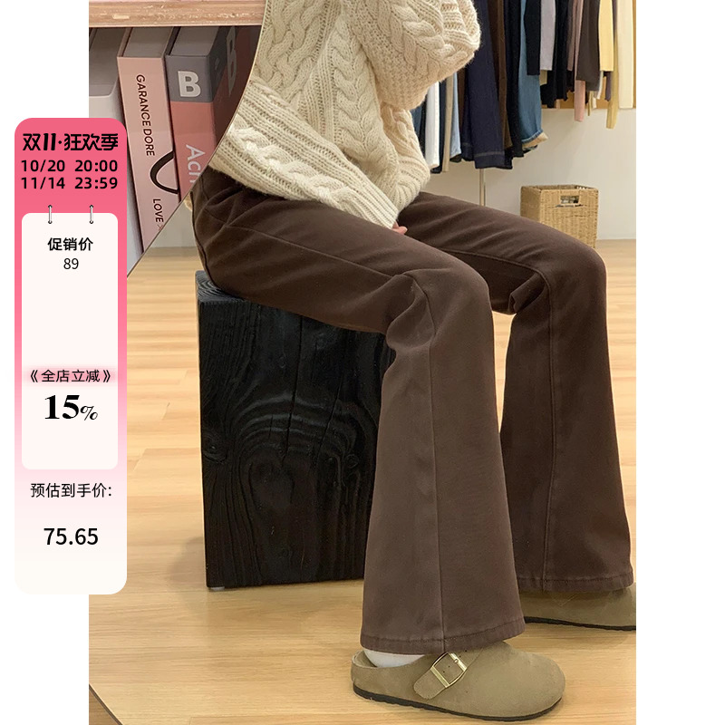美式咖色弯刀牛仔裤大码女装秋冬新款胖mm宽松显瘦直筒阔腿拖地裤
