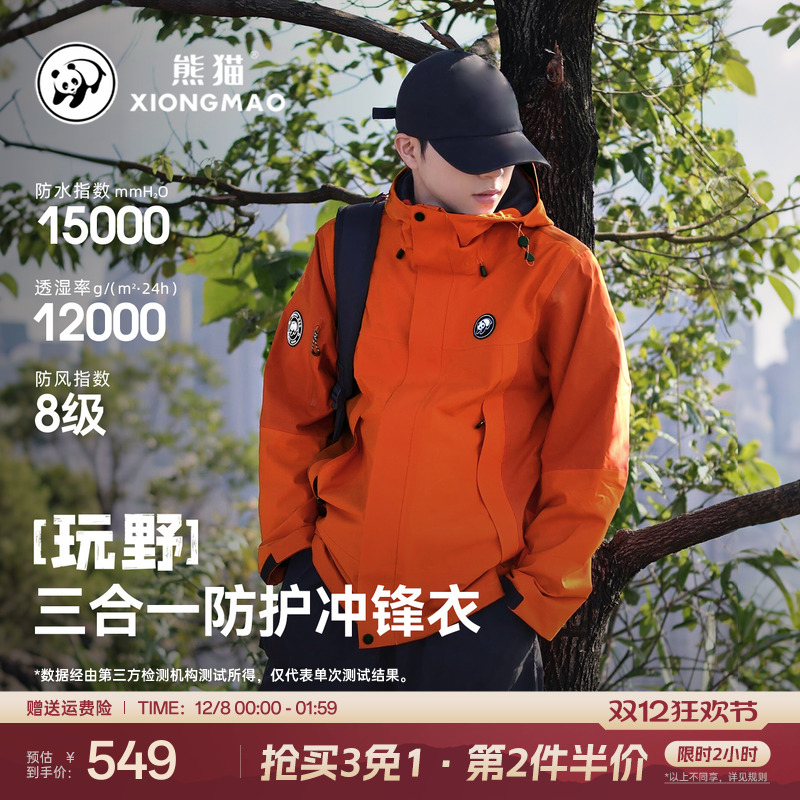 玩野熊猫户外时尚男装三合一冲锋衣新款休闲三防连帽夹克橙色外套