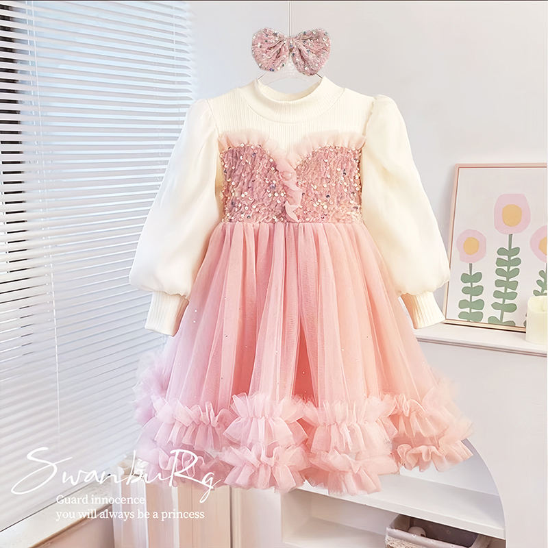 3-5岁外单女童童装春秋新款卡通亮片公主裙薄拉绒长袖洋气连衣裙