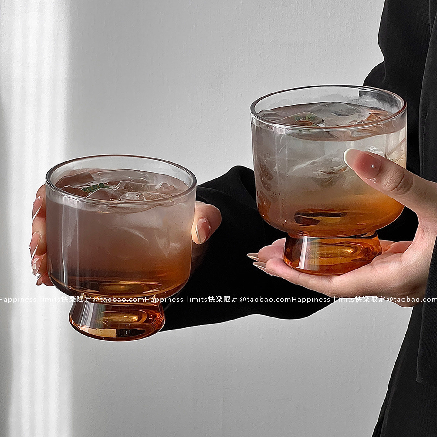 高级感复古光底玻璃杯小众微醺杯高脚杯酒杯甜品咖啡杯饮品饮料杯