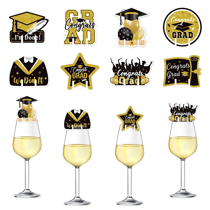 毕业派对高脚杯酒杯装饰插卡毕业季聚会饮料杯学士帽插牌装饰道具