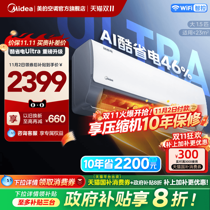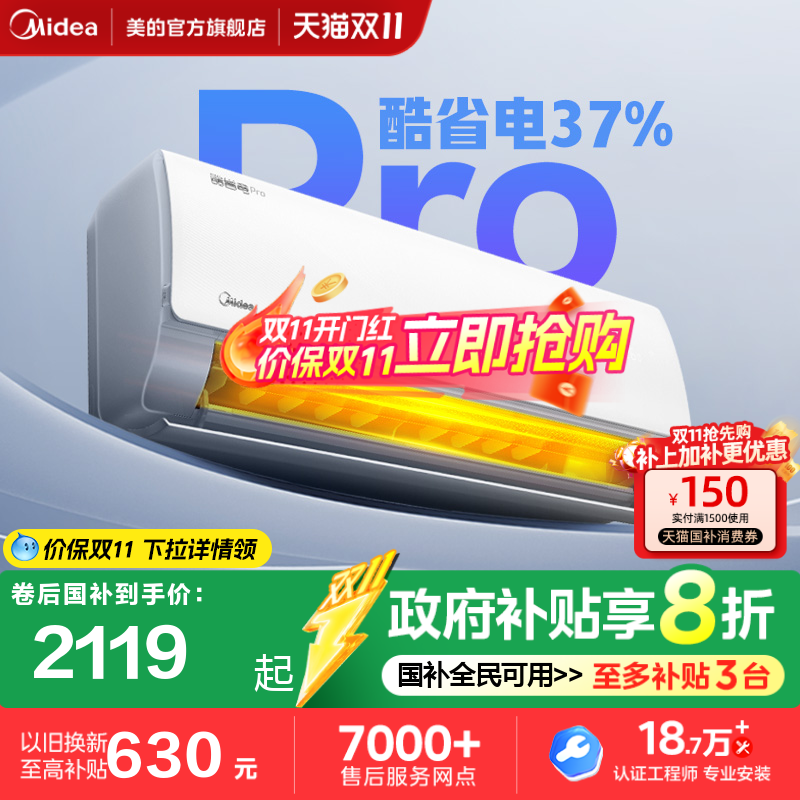 政府补贴美的空调1匹1.5匹家用酷省电Pro挂机变频冷暖一级能效