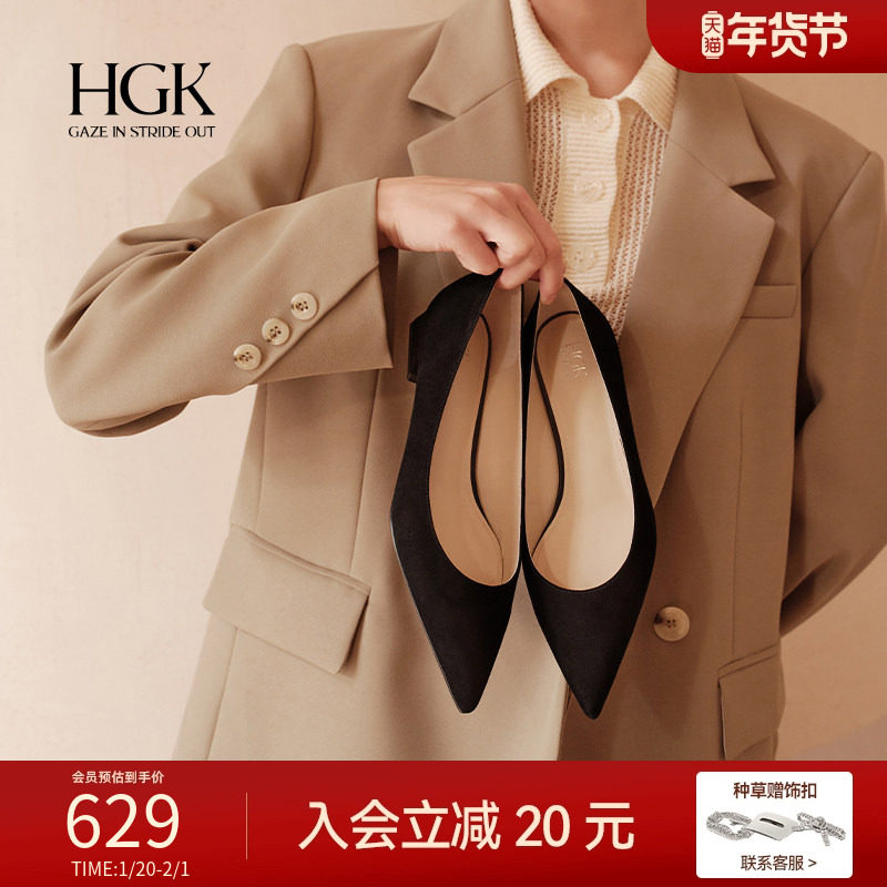 HGK花苞鞋 羊绒舒适通勤不累脚粗跟尖头黑色低跟单鞋女WAI01AQ5