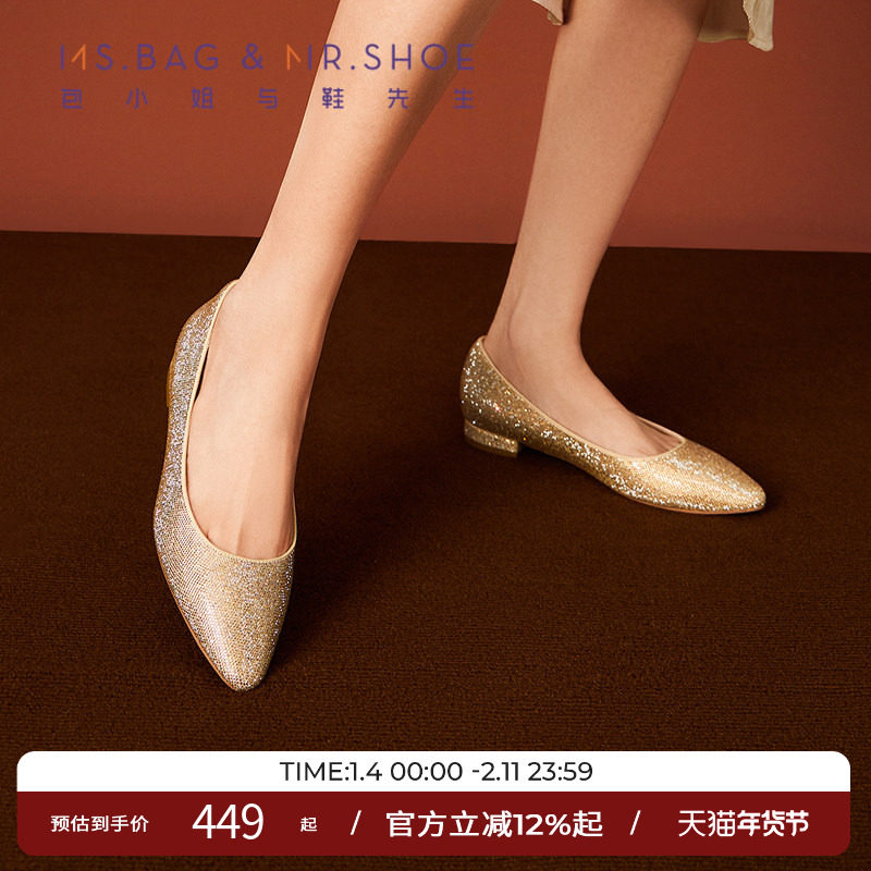 MALOVE MZ王妃鞋新款3.7cm尖头水晶低跟单鞋女职业通勤百搭平底鞋