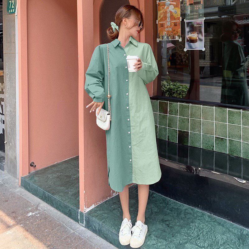 孕妇装春装长袖连衣裙胖mm中长款显瘦宽松衬衫裙韩版大码长裙上衣