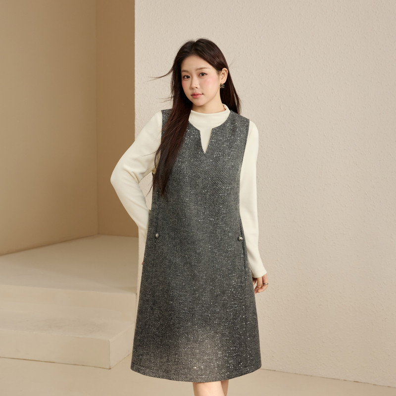2025年春装新款娃娃领连衣裙女显瘦胖mm套装小香风毛呢羊毛