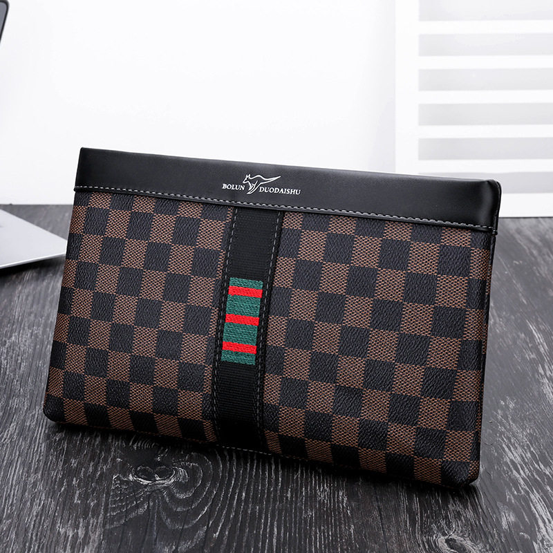 仅亏一天牛皮新款男士手包信封包大容量方格款手抓包棋盘格手拿包