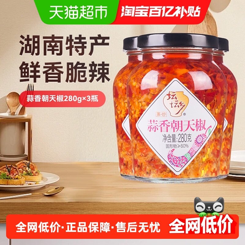 坛坛乡湖南辣椒酱蒜香朝天椒280g*3瓶下饭拌饭辣酱豉香朝天椒