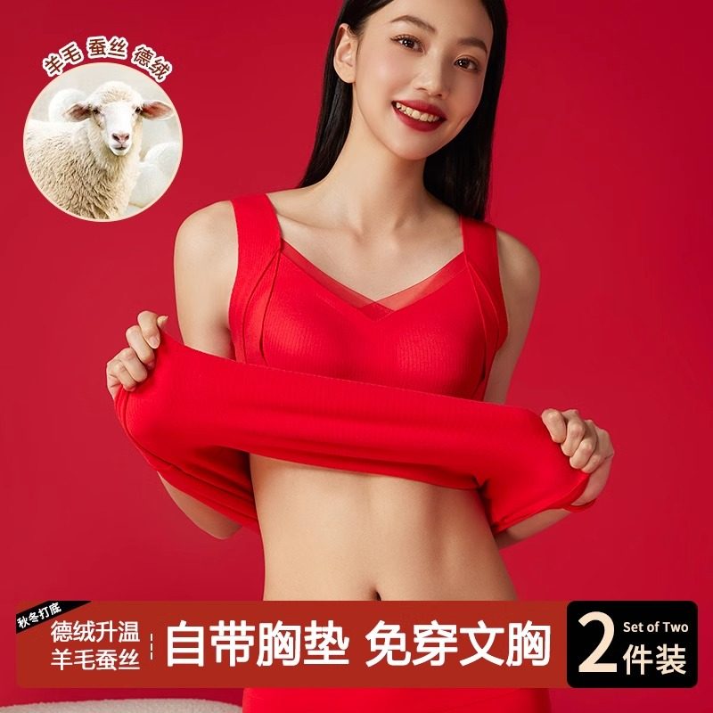 正品牌文胸罩本命年大红色保暖背心内衣女秋冬加绒蚕丝羊毛带胸垫