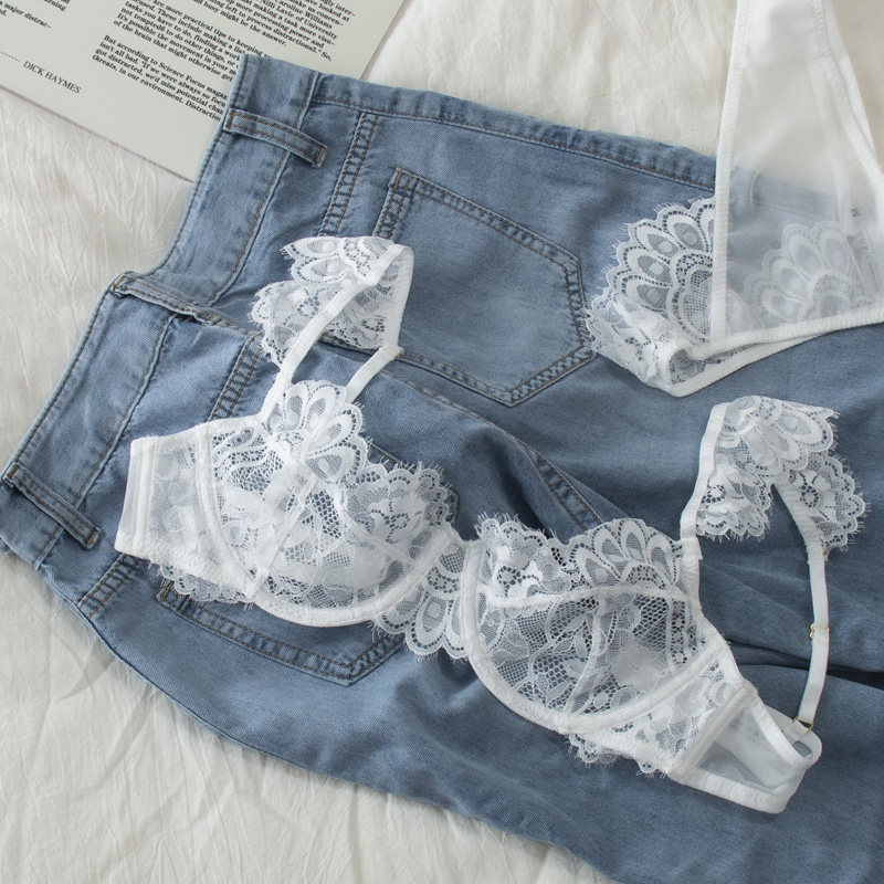 日系性感网纱薄杯蚕丝莫代尔文胸罩防下垂软钢圈内衣套装大胸显小