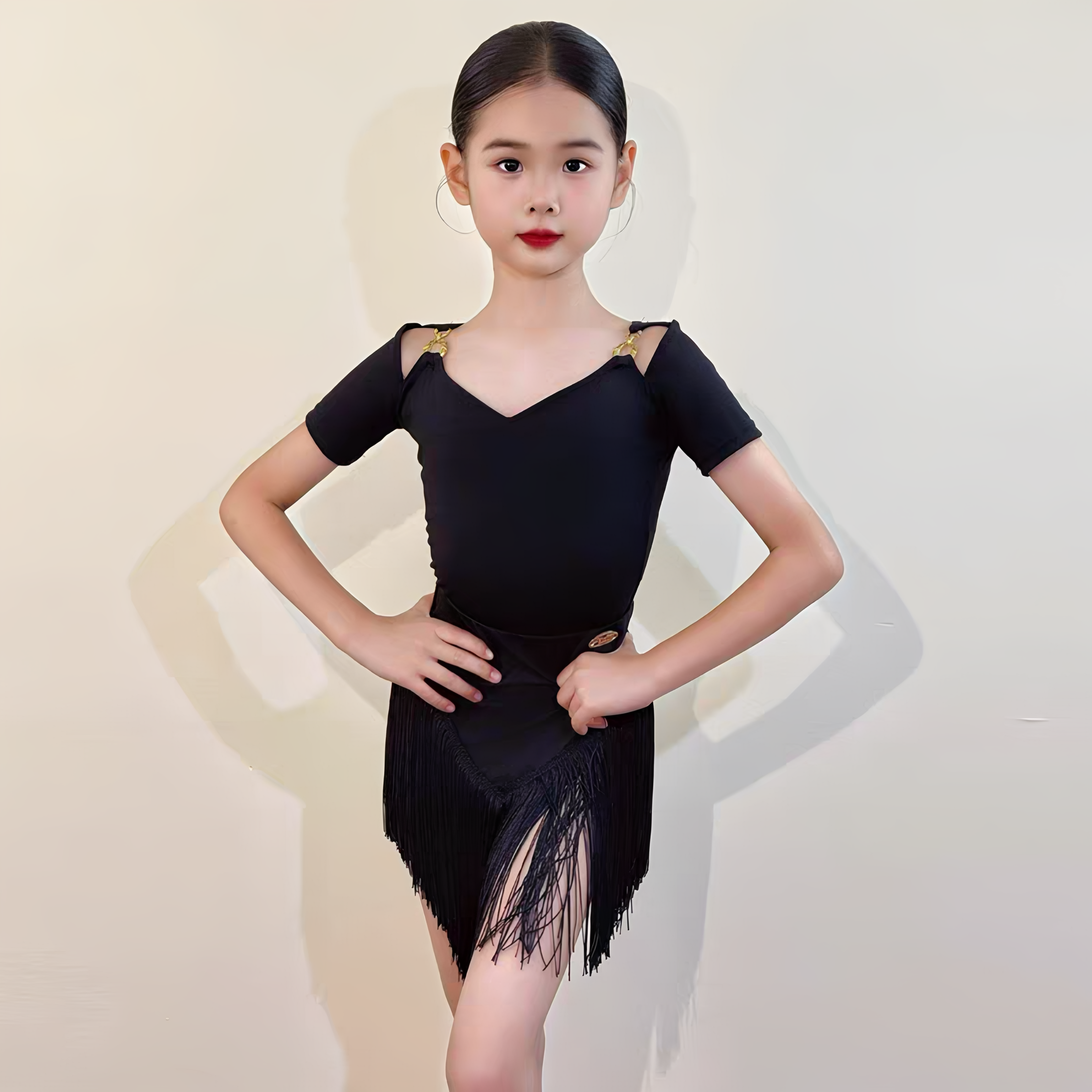 拉丁舞服女童舞蹈训练功表演连体上衣长袖流苏裙儿童黑色上课套装