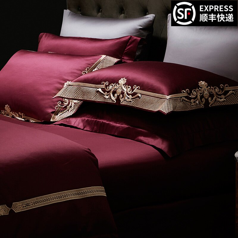 欧式婚庆酒红色高档床上四件套140支全纯棉结婚床上用品别墅被套