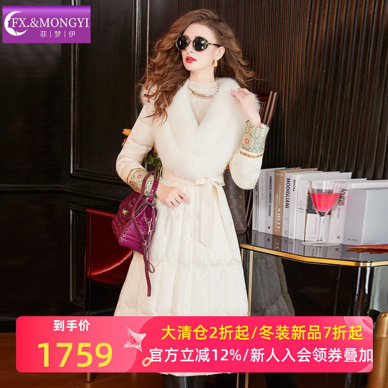 菲梦伊狐狸毛领90白鹅绒羽绒服女冬季轻薄高端贵妇绣花中长款外套