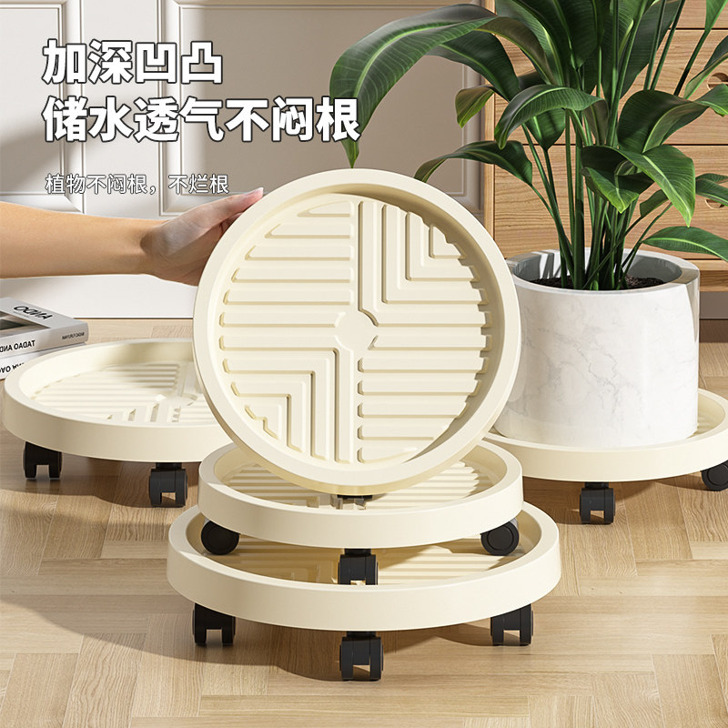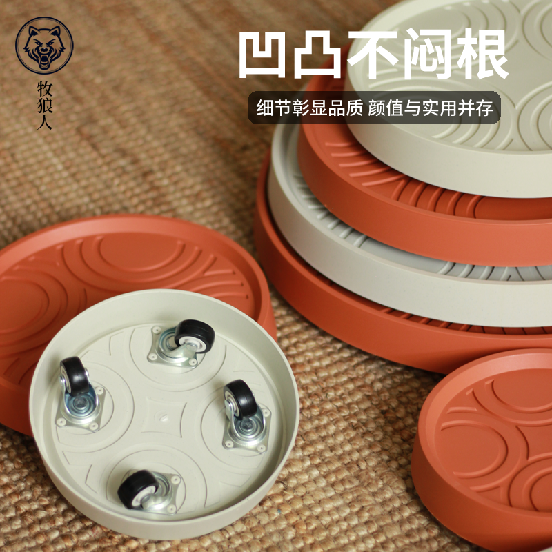 牧狼人隐藏式移动花盆托盘万向轮带轮底座圆形塑料滚轮底盘接水盘
