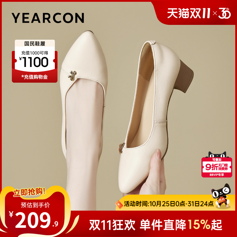意尔康女鞋2025秋季大码粗跟单鞋尖头真皮通勤工作皮鞋法式配裙子