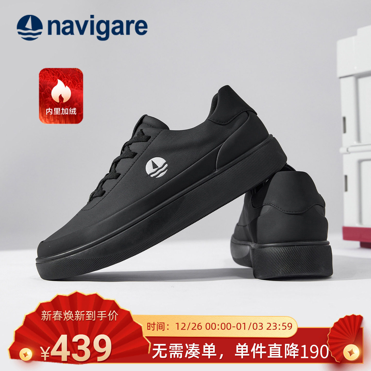 Navigare意大利小帆船男士加绒板鞋2025秋冬季新款黑色真皮休闲鞋