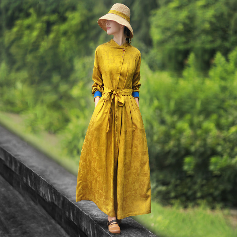 【檀香】素心自制民族风连衣裙秋冬复古立领加厚加绒提花宽松长裙