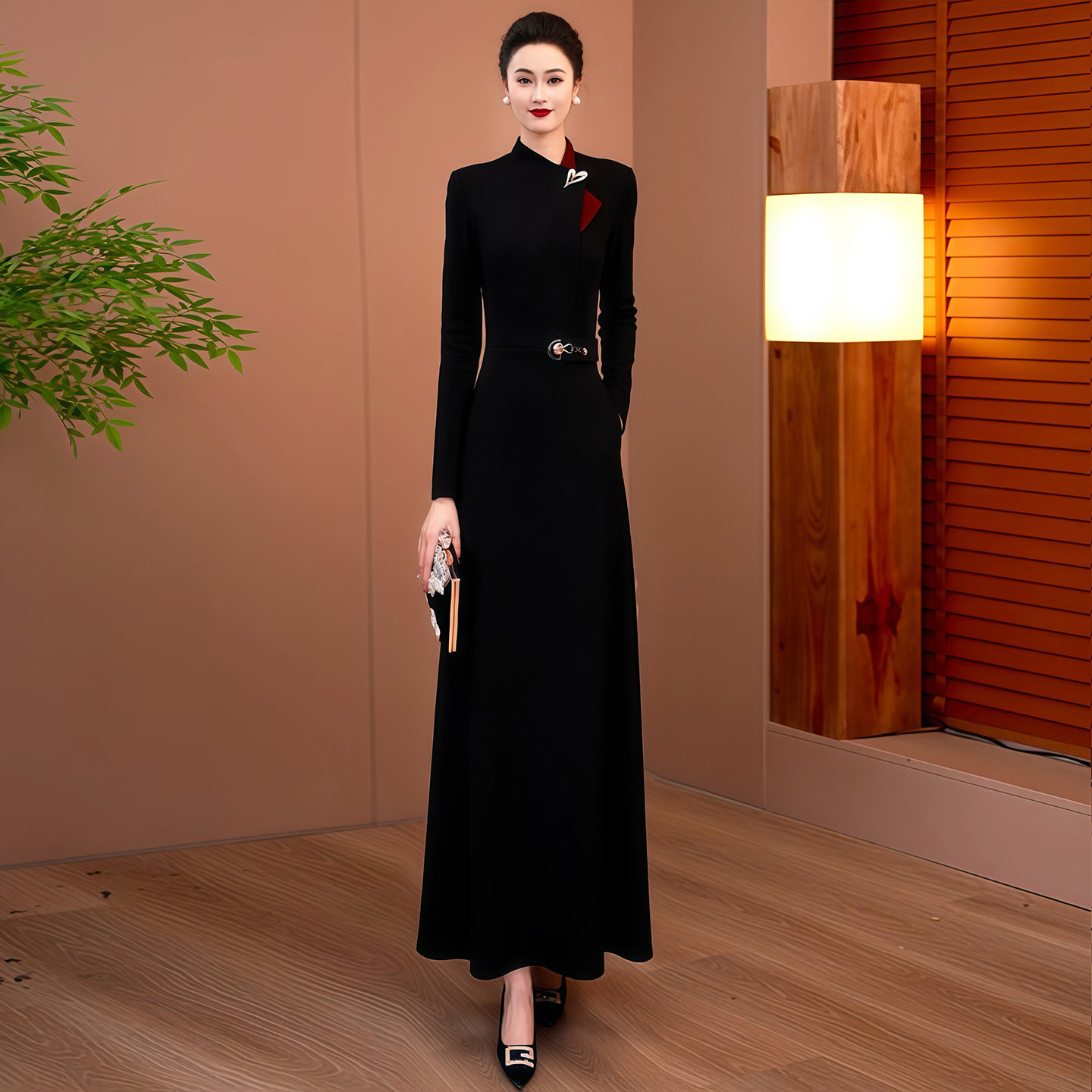 黑色长款加绒加厚连衣裙女冬2024新款新中式高级感收腰超长裙1020