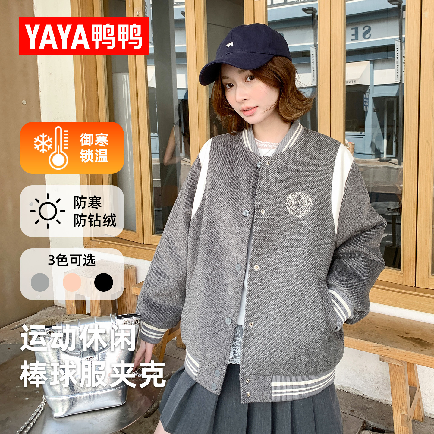 YAYA鸭鸭短款秋冬季棒球服羽绒服女立领撞色条纹防寒锁温暖气外套