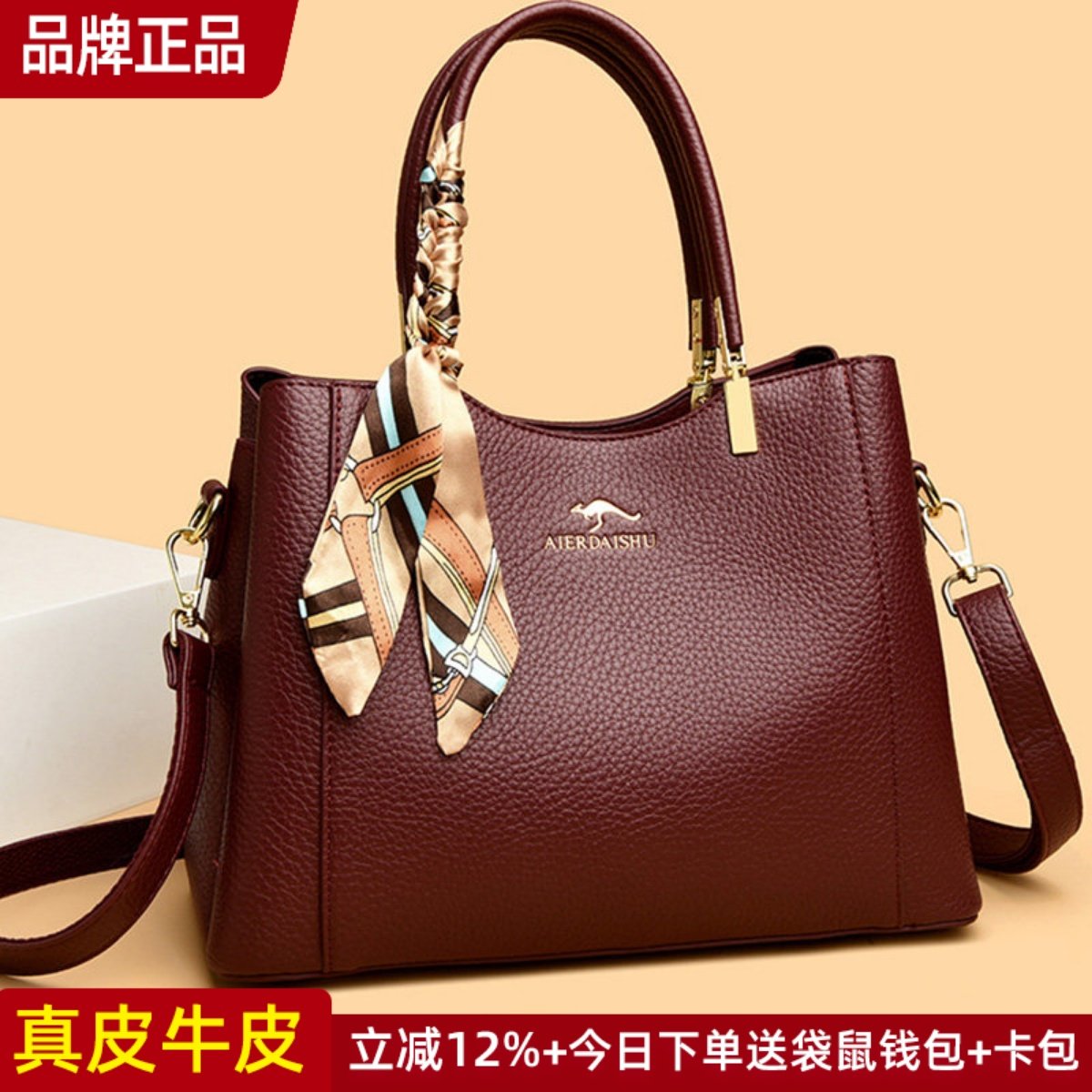 袋鼠真皮女包手提包女士包包2025新款妈妈包中年大容量时尚斜挎包