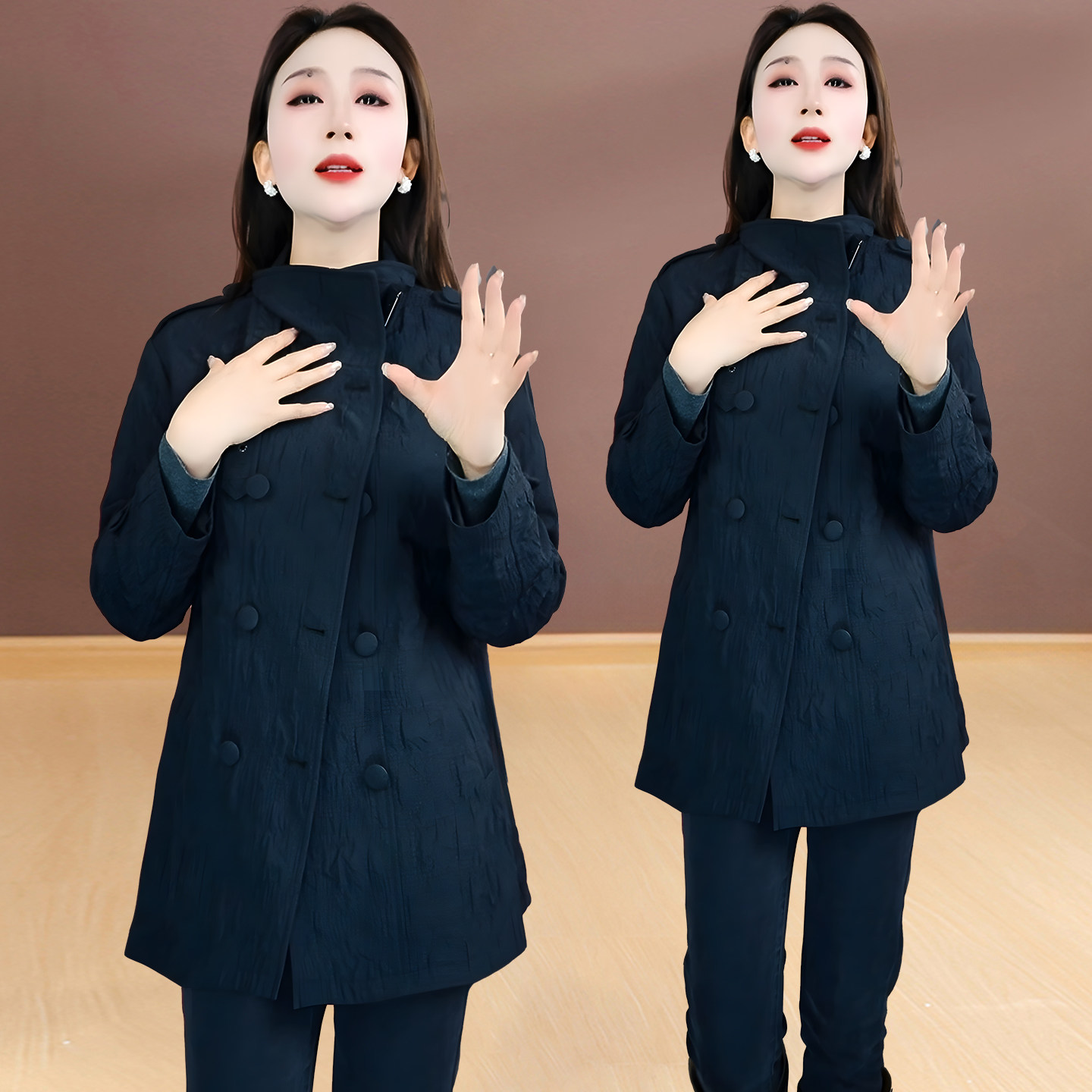 大码妈妈装风衣春秋新款时尚双排扣上衣女装春秋洋气外套开衫中长