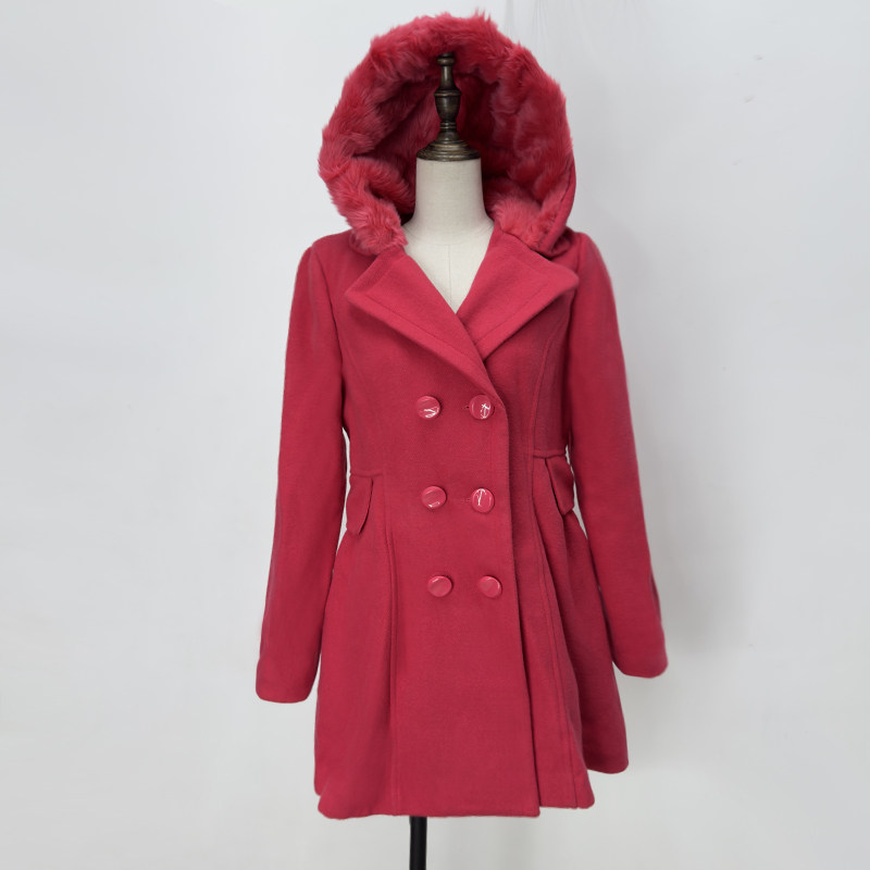 玫红色连帽羊毛呢大衣双排扣中长款秋冬厚款加大码呢子风衣外套女