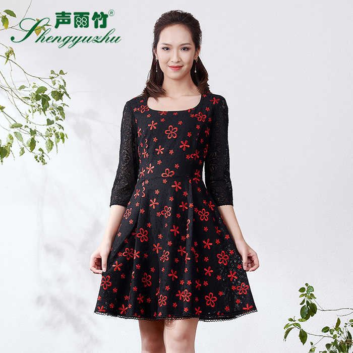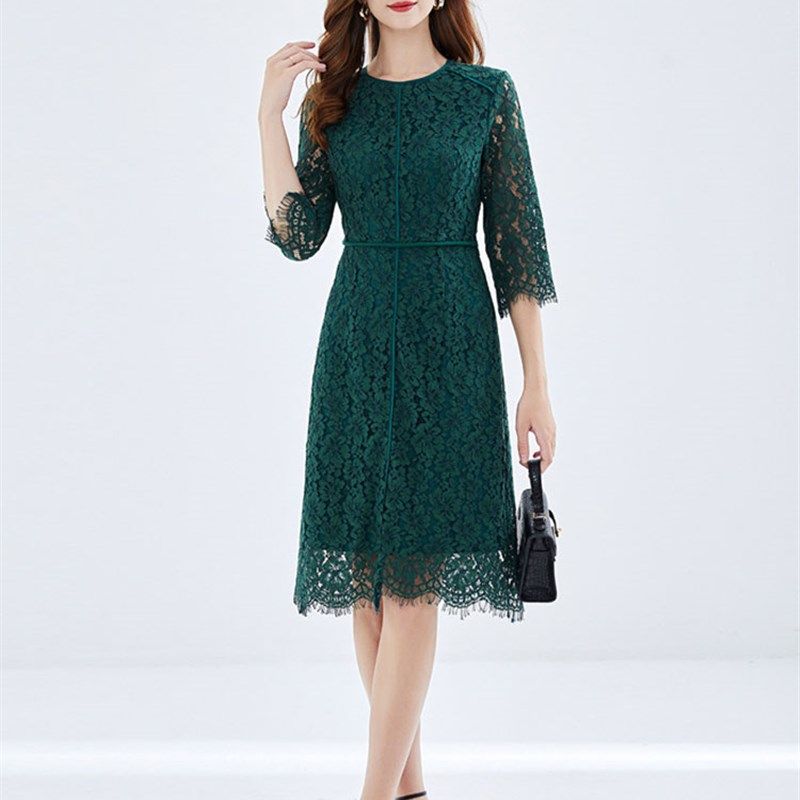 品牌折扣蕾丝七分袖连衣裙女洋气质百搭显瘦透气圆领妈妈装a字裙