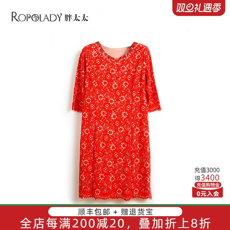 胖太太大码女装巴黎春装新品红色蕾丝七分袖V领连衣裙816219540