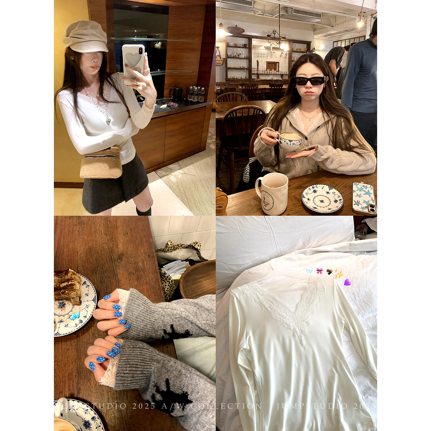 草莓跳性感蕾丝v领七分袖T恤女冬季设计感内搭打底衫修身显瘦上衣