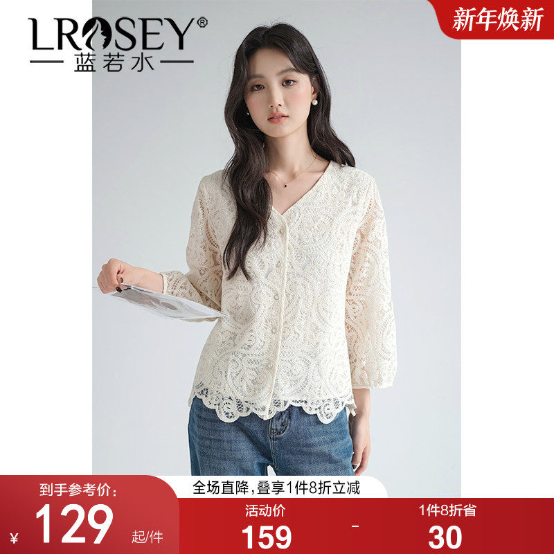 蓝若水大码女装胖MM镂空蕾丝七分袖衬衫2026春季新款显瘦V领上衣
