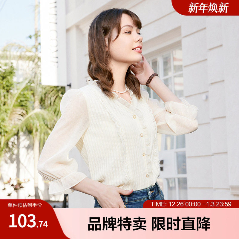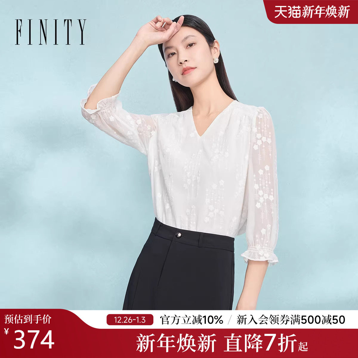 FINITY菲妮迪雪纺衫2025秋新款法式蕾丝七分袖优雅V领抽褶上衣女