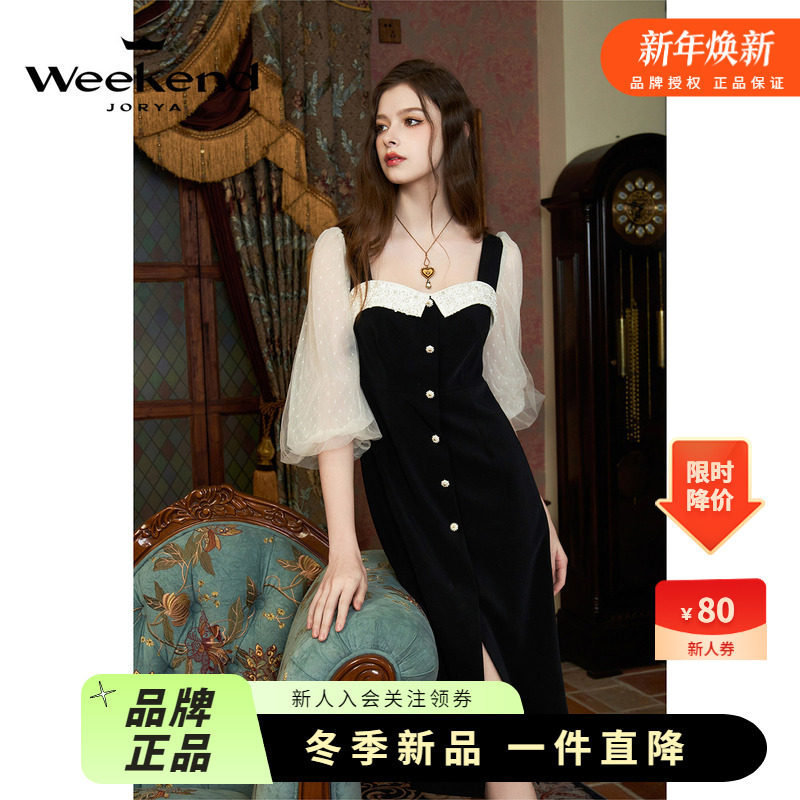 卓雅周末2024春季新款方领珠片绣拼接蕾丝七分袖连衣长裙EJWEAF41