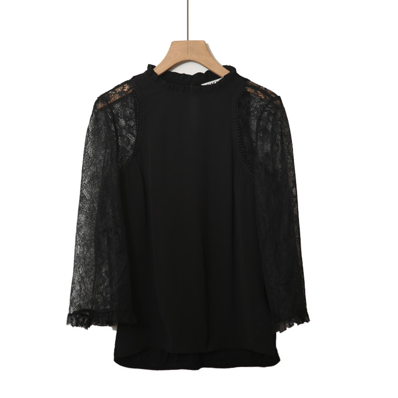 ins轻熟风斜领排扣拼接蕾丝边七分袖修身收腰设计褶皱纯色衬衫女