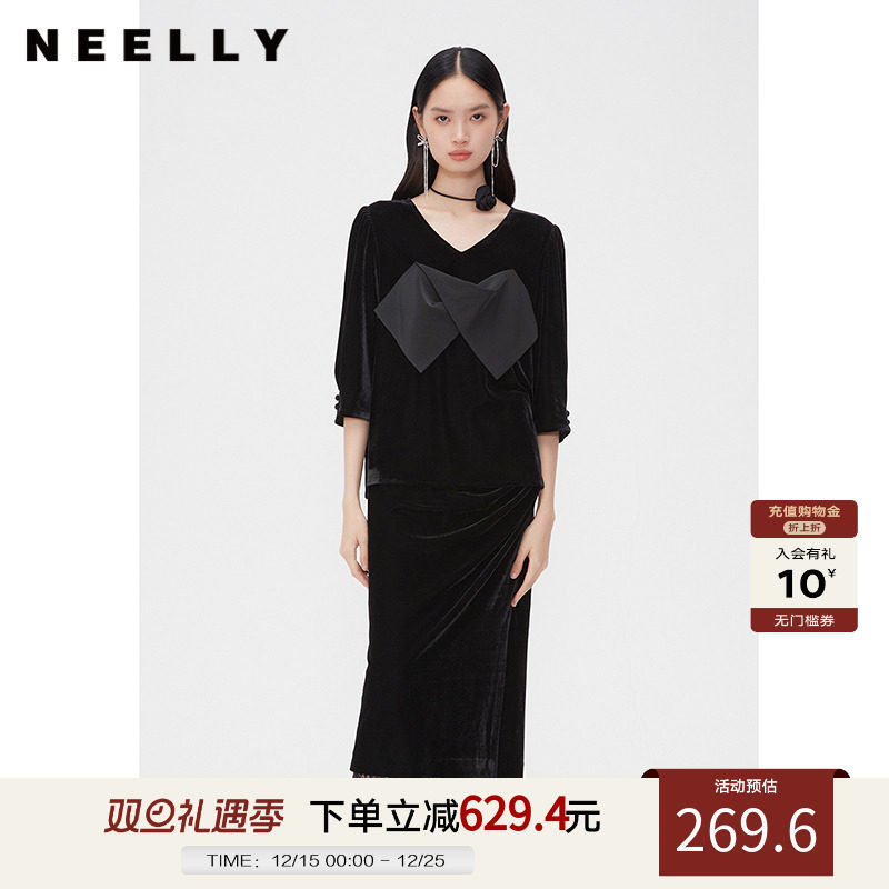 NEELLY纳俪商场同款丝绒套装裙秋冬蕾丝拼接半身裙女七分袖上衣