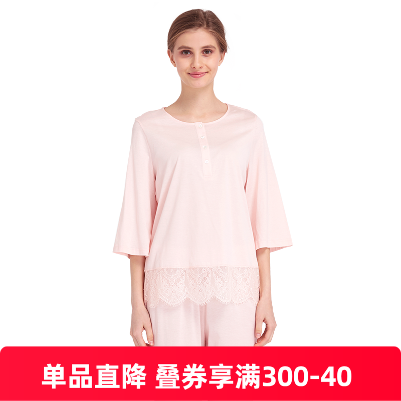 铜牛春夏120支半开襟蕾丝七分袖女纯棉睡衣家居套装VJ070