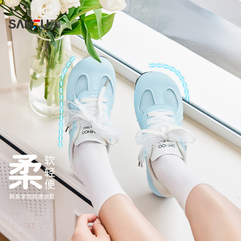 三福低帮板鞋女夏季韩系少女德训鞋双鞋带拼接蕾丝网面女鞋842285