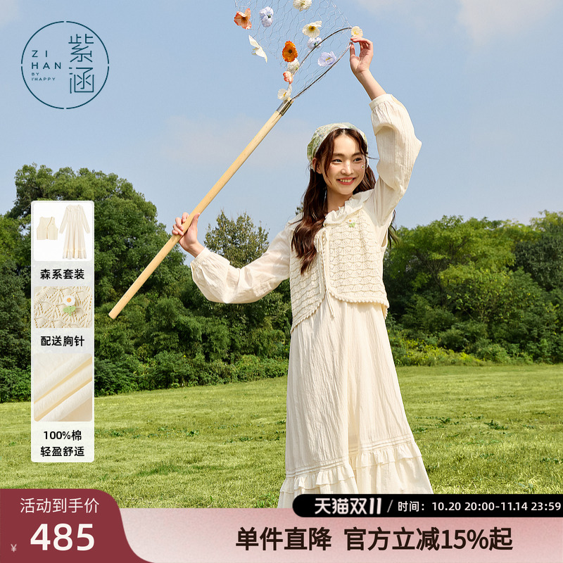 紫涵手工针织马甲背心蕾丝翻领拼接连衣裙两件套装女春秋季新款潮