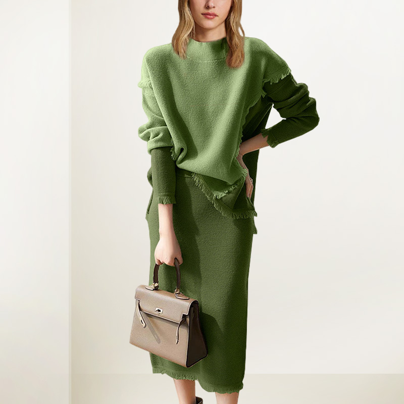 韩剧穿搭小香风套装高级感欧货漂亮时尚绿色针织衫皮裙子两件套秋