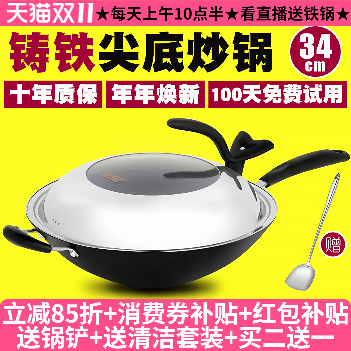 豪森炒锅不粘锅尖底生铁铸铁锅无涂层锅具无烟锅不锈手工铁锅34cm