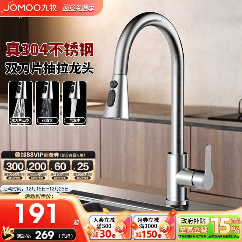 九牧卫浴抽拉式龙头冷热厨房水龙头不锈钢防溅洗菜盆水槽延伸龙头