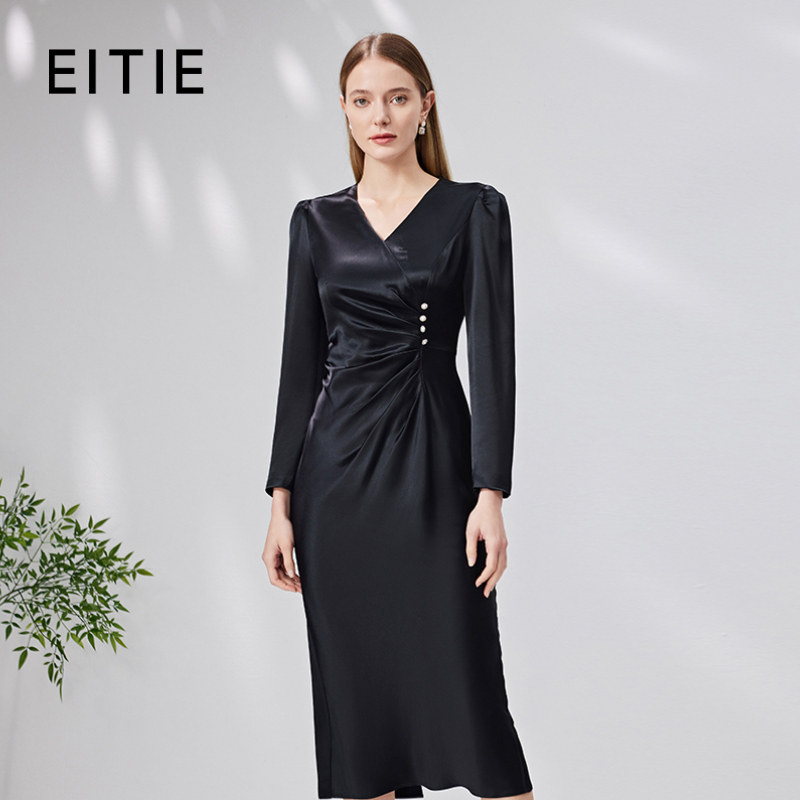 【设计总监然姐】EITIE爱特爱简约气质收腰V领桑蚕丝连衣裙显瘦