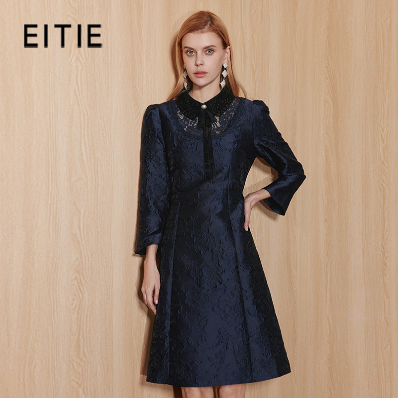 EITIE爱特气质翻领镂空绣花收腰a字挺括显瘦礼服连衣裙秋季新款