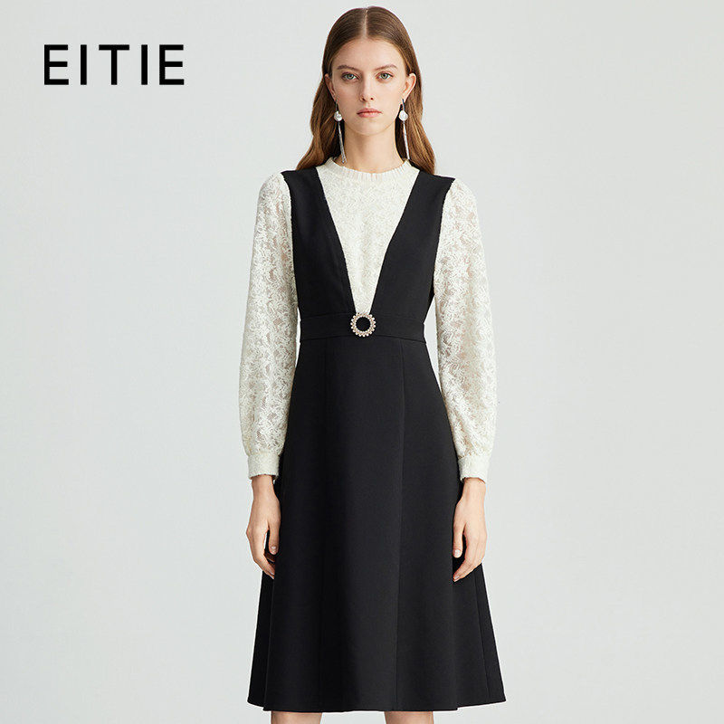 【设计总监然姐】EITIE爱特爱木耳领蕾丝拼接假两件收腰连衣裙