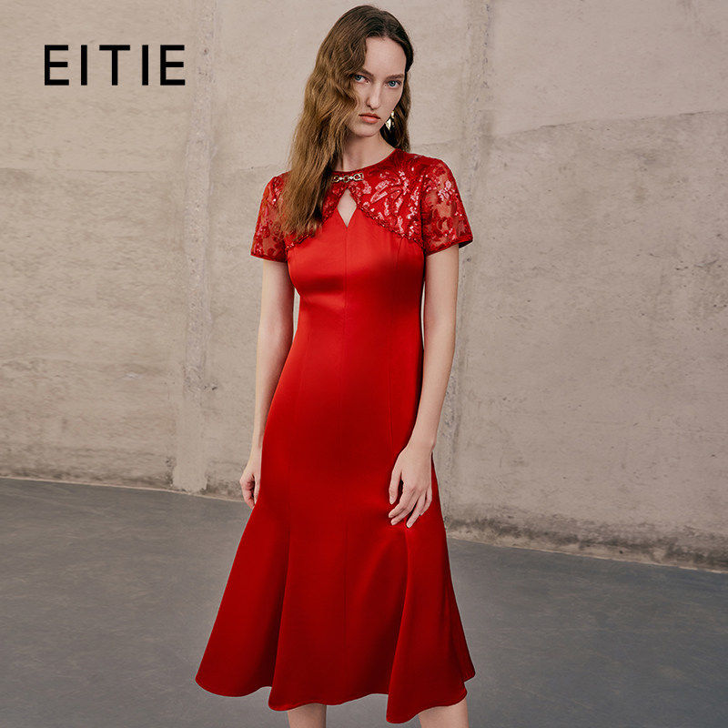 【设计总监然姐】EITIE爱特爱精致蕾丝网纱红色礼服连衣裙春新款