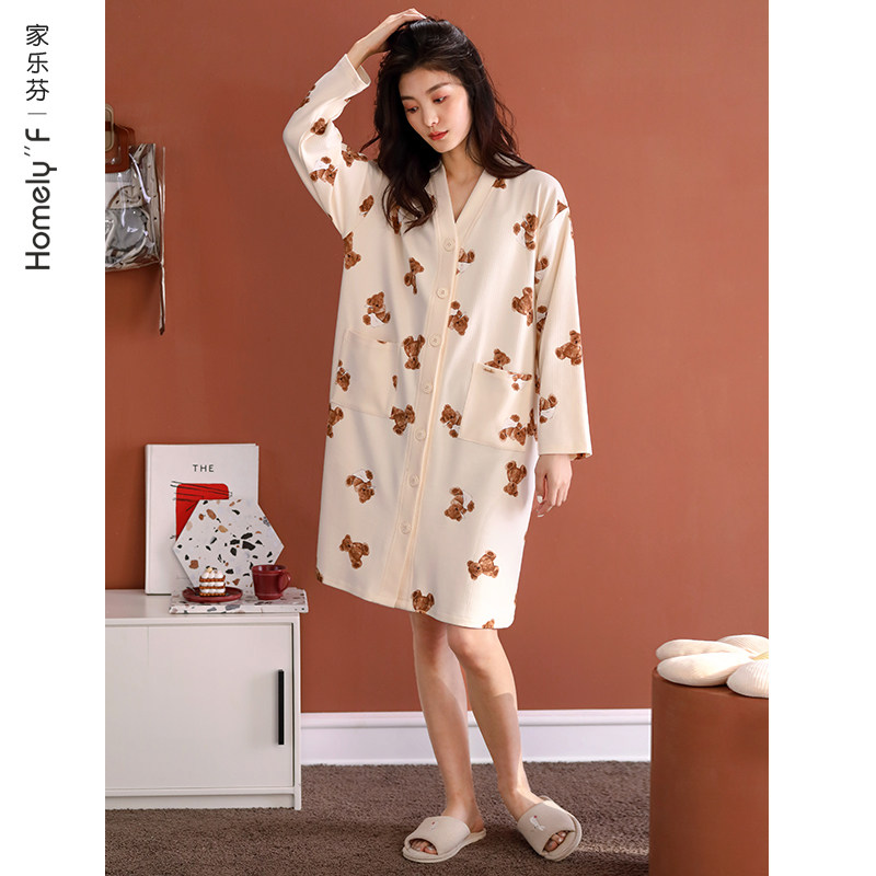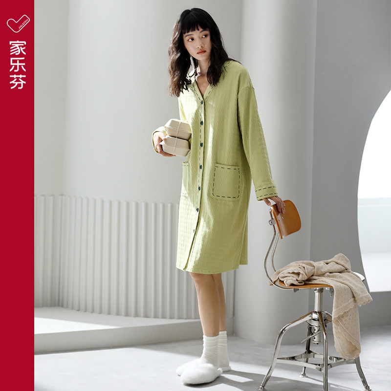 家乐芬睡裙女士睡衣春秋款秋季长袖纯棉薄款开衫长款衬衫大码休闲