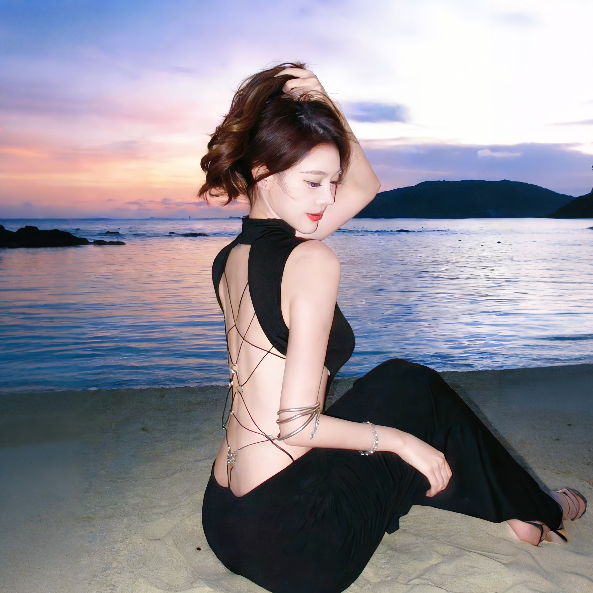 旅行拍照穿搭海边度假沙滩长裙仙女气质性感大露背挂脖式连衣裙子