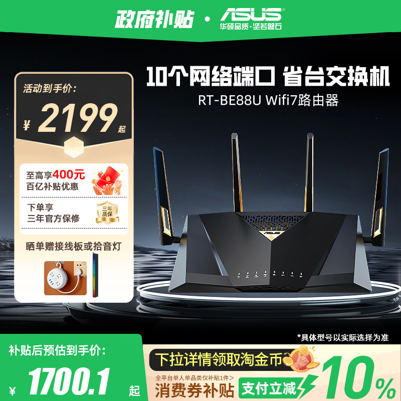 【政府补贴10%全国可领】华硕RT-BE88U Wifi7路由器企业级万兆无线电竞游戏家用路由智能组网10G口大户型覆盖