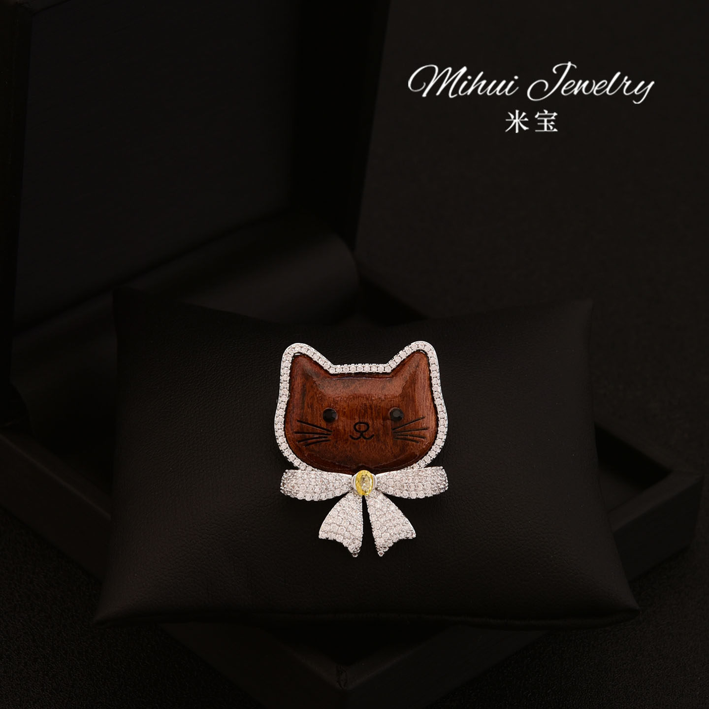 韩国精致蝴蝶结猫咪胸针天然胡桃木动物小猫别针少女甜美胸花礼物