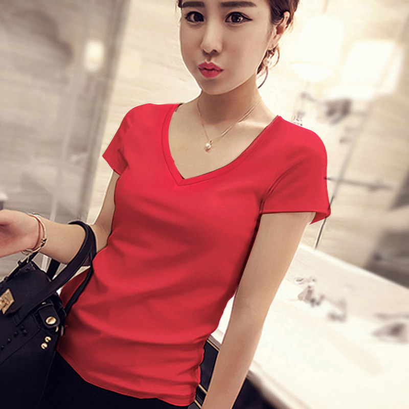 红色短袖v领t恤锁骨夏天女装2025年新款修身减龄纯棉薄款体恤上衣